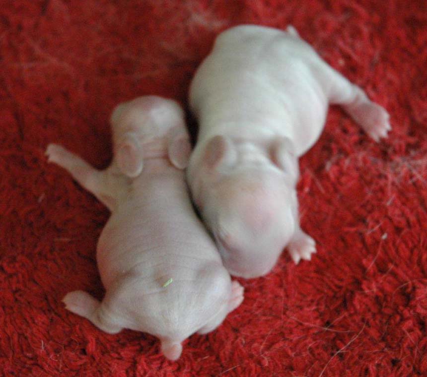 down toward the skin. Eye circles, inside of ears, underside of tail, and belly are to be white.