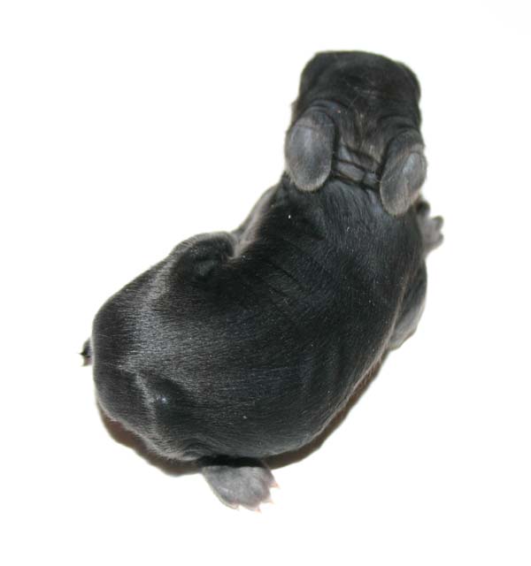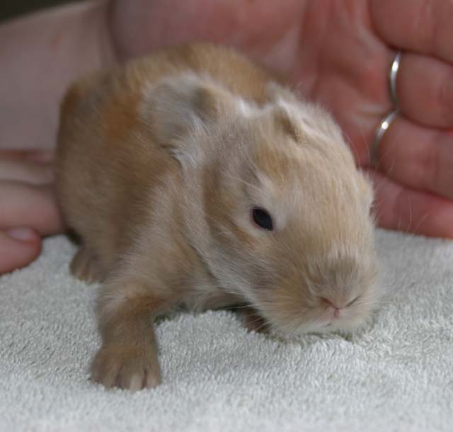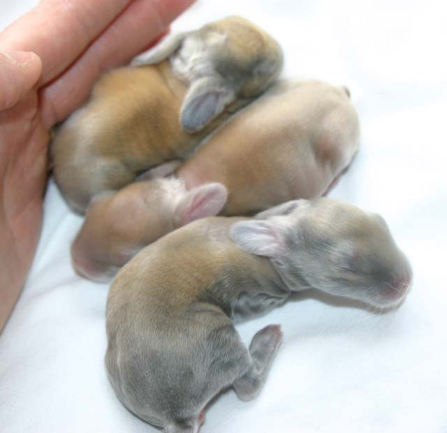 A two or three day old black tort kit. Notice the darker shading on the sides and head. | At 2 weeks, a Tort EA looks like a Tort Holland in coloring. | As adults, the Torts wool is much lighter then when younger. Note how dark the Tort nose is compared to the 4 mth Blue Tort below. |
