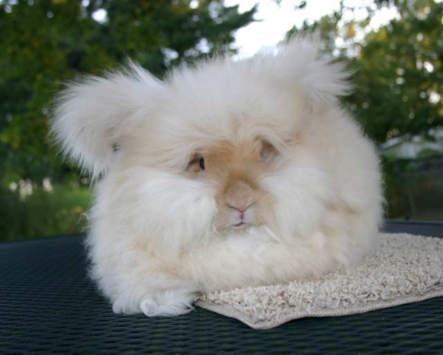 | Kits look black, except they have agouti markings - white tummy, white inside of ears. | Eight week old Chestnut buck. | Awesome Angora's Amelia. Pix courtesy of JoAnn Schoolcraft. |